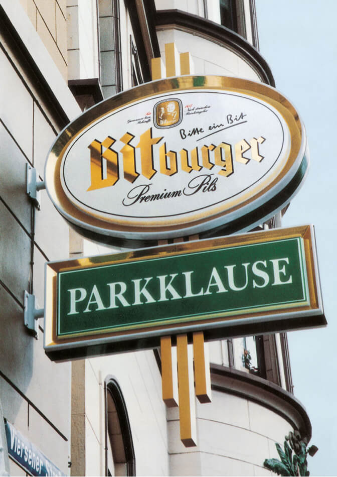 Passo dopo passo la Bitburger introduce la nuova pubblicità esterna Bitburger con i colori bianco e oro del suo marchio, allo scopo di sottolineare la qualità del marchio Bitburger.