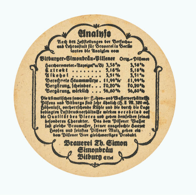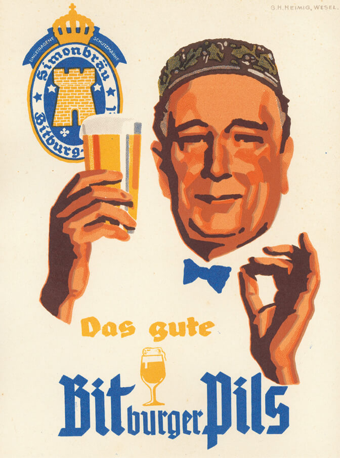 L’8 febbraio 1909, Bitburger produce la sua prima birra “Bitburger Simonbräu Pilsener” e, per questa occasione, Theobald Simon lancia la prima campagna pubblicitaria su larga scala del birrificio.