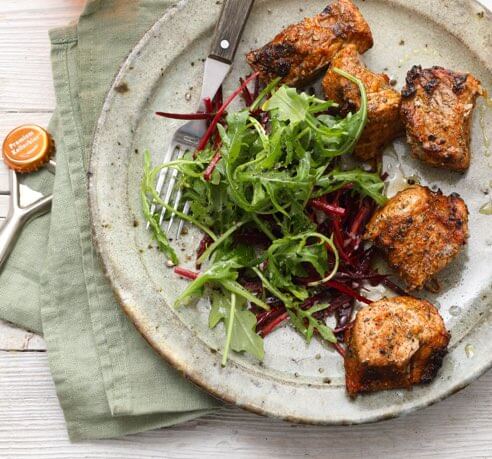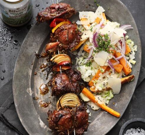 Spiedini churrasco con insalata di rafano e vinaigrette alla Kellerbier