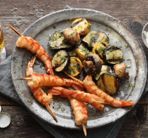 Spiedini di gamberi in glassa al luppolo, verdure alla griglia con maionese all’aglio