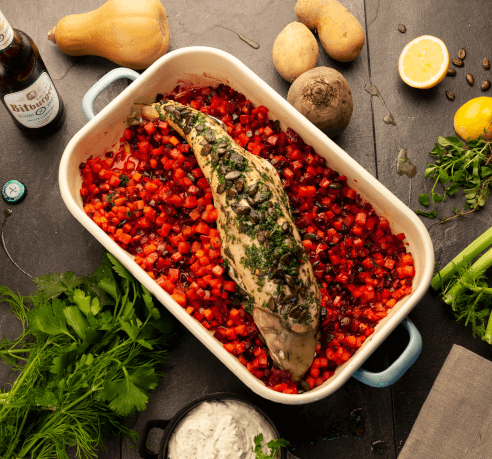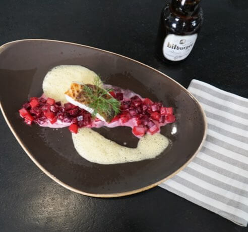 Skrei arrosto con ragù di barbabietole e patate e salsa di burro alla birra
