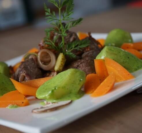 Filetto di vitello bollito alla griglia con spiedini di zucchine