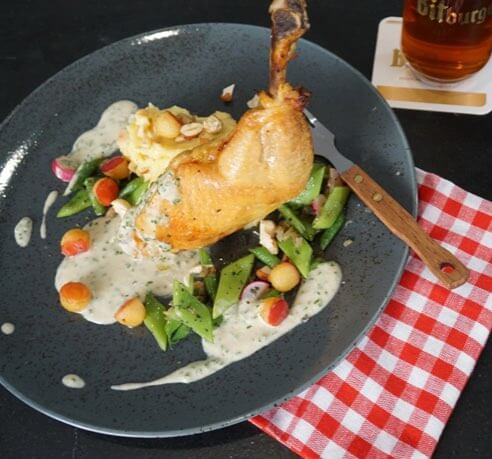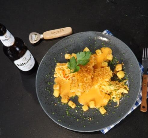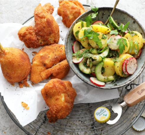 Pollo fritto all’aroma di luppolo con insalata di patate e cetrioli