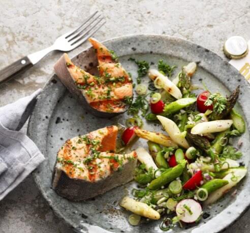 Cotolette di trota alla griglia con insalata di asparagi al luppolo