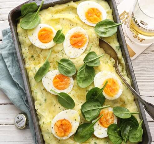 Sformato di patate schiacciate con uova alla griglia e spinaci baby