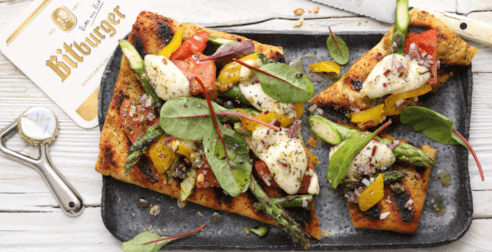- Dividere i pomodori in quarti, eliminare il torsolo e tagliarli a pezzetti. Lavare il peperone, togliere i semi e tagliarlo a dadini. Pulire gli asparagi, pelare il terzo inferiore e accorciare la parte finale di circa 1 cm. Strofinarli quindi con un po’ d’olio, insaporirli con il sale e grigliarli a coperchio chiuso per 3 - 4 minuti. Lasciar raffreddare gli asparagi e tagliarli a pezzetti diagonalmente. Spezzettare la mozzarella con le mani.
