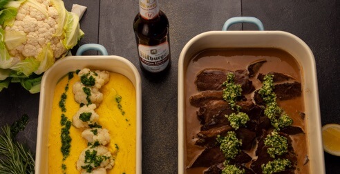 Guanciale di bue in salsa di burro alla Kellerbier con gremolata di cavolfiore e polenta
