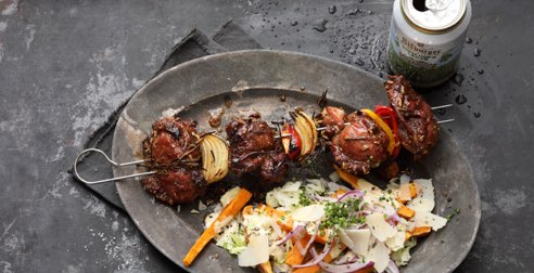 - Per l’insalata distribuire sul piatto l’insalata iceberg e le patate dolci. Mescolare la maionese con la birra e versare la salsa così ottenuta sull’insalata come condimento. Aggiungere le erbe aromatiche, il formaggio e le cipolle fritte e servire gli spiedini insieme all’insalata.