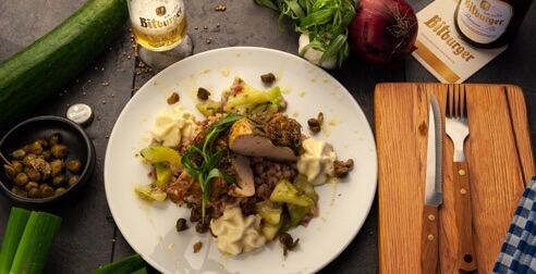 - Tagliare finemente a dadini la cipolla bianca e imbiondirla in un‘altra padella con un po’ di olio d’oliva. Aggiungere l’orzo perlato cotto e sfumarlo con un bicchierino di Bitburger Premium Pils. Lasciarlo cuocere brevemente e aggiungere una piccola quantità di brodo di pollo. Aggiungere anche la salciccia di fegato mescolando continuamente il composto ed eventualmente insaporire con sale e pepe. A seconda della consistenza ottenuta, aggiungere altro brodo di pollo, fino ad ottenere una massa densa e cremosa. Poco prima di servire il piatto, aggiungere un po‘ di cipollotto tagliato.