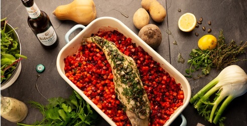 Salmerino alle erbe aromatiche cotto al forno su letto di barbabietola, patata e zucca con crème fraîche al cerfoglio e insalata con vinaigrette alla birra