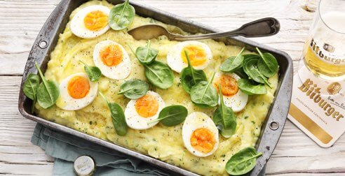 Sformato di patate schiacciate con uova alla griglia e spinaci baby