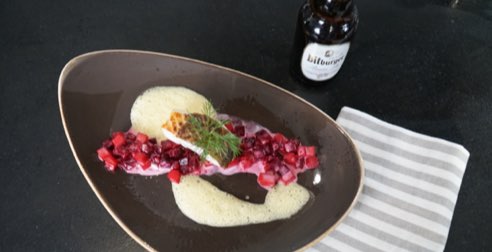 Skrei arrosto con ragù di barbabietole e patate e salsa di burro alla birra