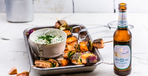 Raccomandazione: girare gli spiedini di salmone una sola volta. In questo modo si forma un’appetitosa crosta su entrambi i lati e il salmone resta ancora tenero all’interno, con una consistenza vitrea. Perfetta come accompagnamento: una Bitburger Helles Lagerbier – senza glutine.