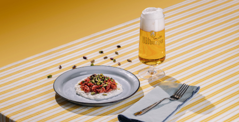 La burrata morbida e i pistacchi croccanti valorizzano il corpo rotondo e leggero della Pils. La carne cruda si sposa perfettamente con la sua effervescenza e il finale amarognolo per una tartare sfiziosa con cui stupire i tuoi ospiti.