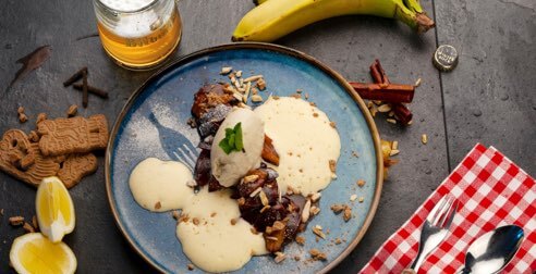 - Togliere le prugne dal forno e rimuovere la buccia di limone e le spezie. Disporre prugne e zabaione su un piatto. Prendere delle cucchiaiate di gelato alla banana e sistemarle sul piatto. Cospargere le scaglie di mandorle e le briciole di Spekulatius. Guarnire con lo zucchero speziato e menta.