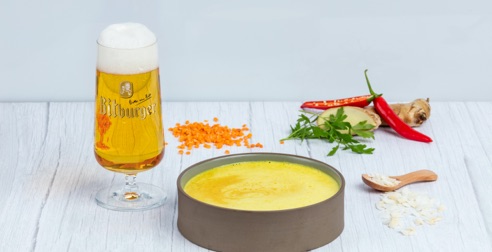 - Aggiungere le lenticchie e deglassare con Bitburger 0,0% Drive. Versare il brodo vegetale e il latte di cocco. Lasciare sobbollire.
