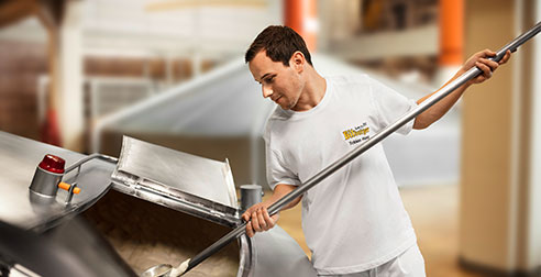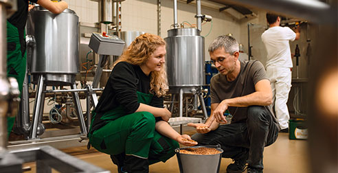 Tutto comincia nella sala di cottura: Qui viene portato il malto precedentemente ricavato dall’orzo nelle malterie con cui collabora il birrificio Bitburger. Il malto viene frantumato in diversi gradi di finezza; in questo modo il corpo interno del chicco viene liberato e i suoi preziosi componenti vengono liberati. Il malto non viene macinato perché in questo caso la sua grana risulterebbe troppo fine: La gluma, ciascuna delle brattee che avvolgono il chicco del cereale, deve essere preservata perché svolge preziose funzioni come strato filtrante naturale durante la fase di filtrazione. Il malto determina in modo decisivo il tipo della birra. In quanto ne definisce colore, sapore e carattere.